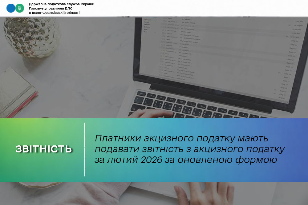В Головному управлінні ДПС в Івано-Франківській області звертають увагу платників акцизного податку, що за лютий 2026 року звітність потрібно подати – до контролюючого органу за місцем реєстрації платника за оновленою формою не пізніше 20 березня 2026 року.