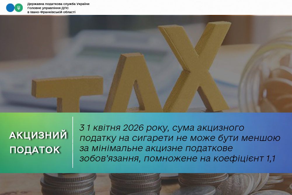 В Головному управлінні ДПС в Івано-Франківській області повідомляють, що з 1 квітня 2026 року, сума акцизного податку на сигарети не може бути меншою за мінімальне акцизне податкове зобов’язання, помножене на коефіцієнт 1,1.