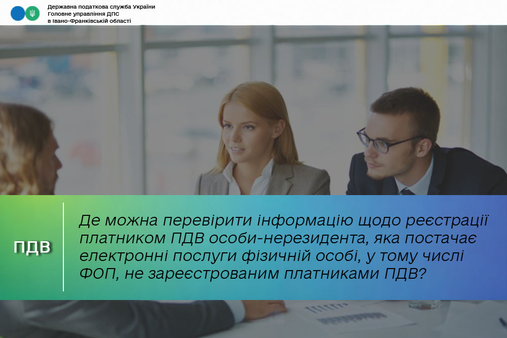 Таким чином, будь-яка зацікавлена особа, у тому числі не зареєстрована платником ПДВ, на безоплатній основі має змогу перевірити інформацію щодо реєстрації платником ПДВ особи-нерезидента, який постачає електронні послуги фізичній особі. На сьогодні доступ до відомостей реєстру платників ПДВ надається шляхом пошуку за податковим номером або індивідуальним податковим номером платника ПДВ через пошуковий сервіс «Реєстр платників ПДВ», що розміщений за посиланням https://cabinet.tax.gov.ua/registers, за умови ідентифікації особи, яка бажає отримати такі відомості, з використанням засобів електронної ідентифікації (кваліфікованим або удосконаленим електронним підписом).