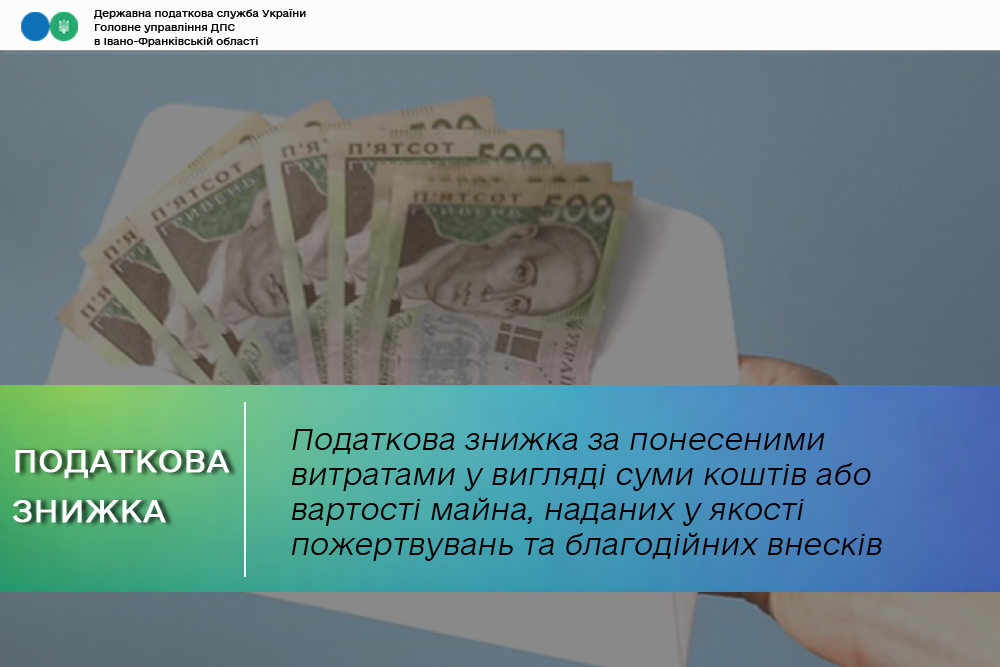 Згідно з п.п. 166.3.2 п. 166.3 ст. 166 ПКУ платник податку має право включити до податкової знижки у зменшення оподатковуваного доходу платника податку за наслідками звітного податкового року, нарахованого у вигляді заробітної плати, зменшеного з урахуванням положень п. 164.6 ст. 164 ПКУ, або у вигляді дивідендів, крім сум дивідендів, які не включаються до розрахунку загального місячного (річного) оподатковуваного доходу, такі фактично здійснені ним протягом звітного податкового року витрати, зокрема, суму коштів або вартість майна, перерахованих (переданих) платником податку у вигляді пожертвувань або благодійних внесків неприбутковим організаціям, які на дату перерахування (передачі) таких коштів та майна відповідали умовам, визначеним п. 133.4 ст. 133 ПКУ, у розмірі, що не перевищує 4 відс. суми його загального оподатковуваного доходу такого звітного року.