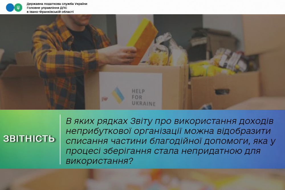 У випадку списання отриманої благодійної допомоги, частина якої у процесі зберігання допомоги стала непридатною для використання у зв’язку з порушенням вимог законодавства України про благодійну діяльність, таке списання необхідно відображати у рядку 3.2 «вартість активів (коштів або майна), вартість товарів (робіт, послуг), які використані на цілі інші, ніж фінансування видатків на утримання неприбуткової організації, реалізації мети (цілей, завдань) та напрямів діяльності, визначених установчими документами, та/або для здійснення неприбуткової (добродійної) діяльності, передбаченої законом для релігійних організацій» частини ІІ Звіту.