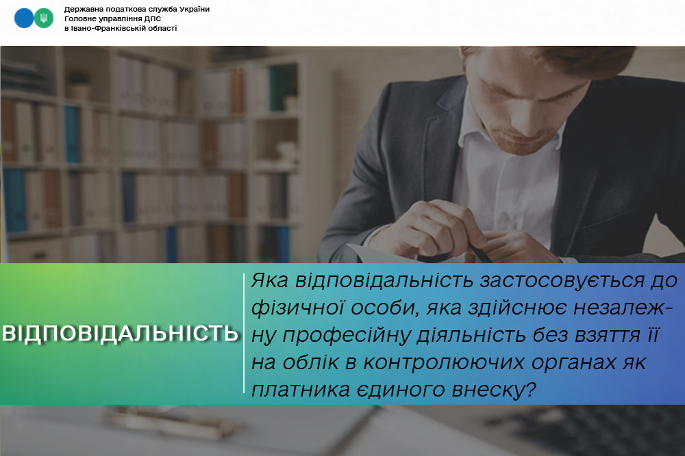Відповідно до ст. 165 прим. 1 Кодексу України про адміністративні правопорушення від 07 грудня 1984 року № 8073-Х із змінами та доповненнями (далі – КУпАП) за порушення порядку нарахування єдиного внеску, неподання, несвоєчасне подання звітності щодо єдиного внеску на особу, яка забезпечує себе роботою самостійно, накладається штраф від тридцяти до сорока неоподатковуваних мінімумів доходів громадян.