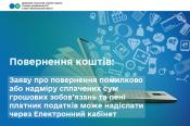 Заяву про повернення помилково та/або надміру сплачених сум грошових зобов’язань та пені платник податків може надіслати через Електронний кабінет