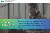 Крім того, абзацом першим п.п. 69.1 п. 69 підрозд. 10 розд. ХХ «Перехідні положення» ПКУ, встановлено, що у разі відсутності у платника податків можливості своєчасно виконати свій податковий обов’язок, зокрема, щодо дотримання термінів сплати податків та зборів платники податків звільняються від передбаченої ПКУ відповідальності з обов’язковим виконанням таких обов’язків протягом шести місяців після припинення або скасування воєнного стану в Україні.